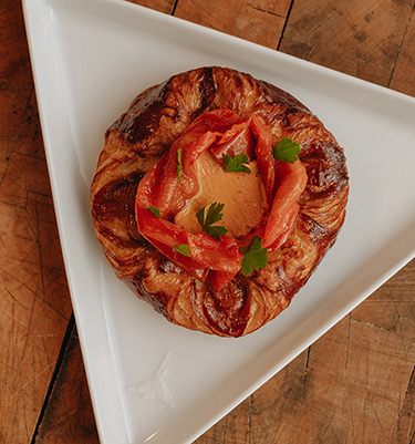 Der Pacojet eröffnet neue Möglichkeiten: Fruchtcremes für Torten und Plunder, veganes Schokoladenmousse, aromatisierte Butter und Öle für Croissants, Focaccia oder Brotteige – ohne die Teigstruktur zu gefährden. „Da stechen keine Rosmarinnadeln durch die Teigschichten. Selbst ledrige Zutaten wie getrocknete Tomaten werden mit dem Pacojet perfekt fein“, erklärt Julian. Auch Romesco-Sauce als Aufstrich ist möglich.