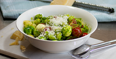 Für den Nudelsalat das Pesto mit gekochten Nudeln, Mozzarella, Kirschtomaten, geriebenem Parmesan und geriebenem Gouda vermengen.