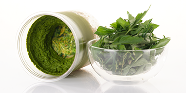 (1) Die Kräuter und den Spinat für 5 Sekunden blanchieren. Dann im Eiswasser abschrecken, mit den restlichen Zutaten vermengen und in ein Pacossier®-Becher füllen.